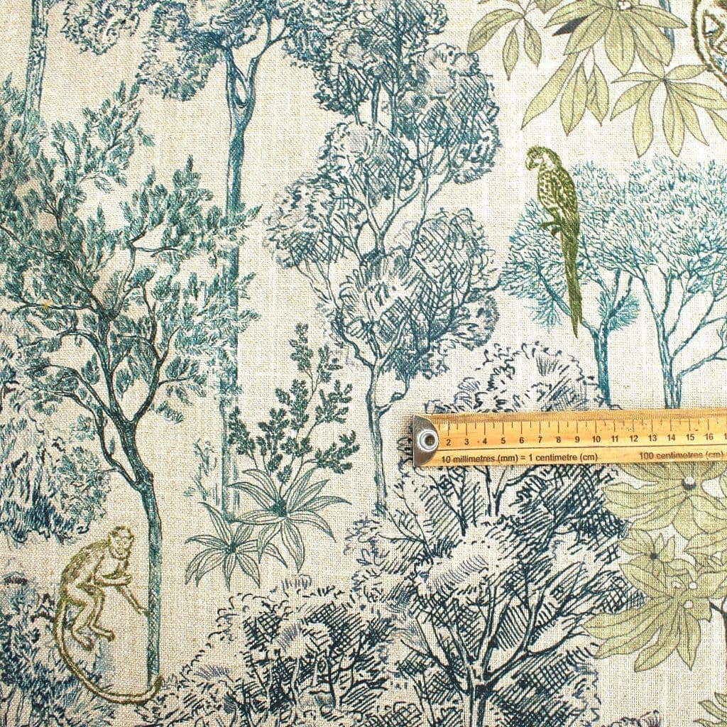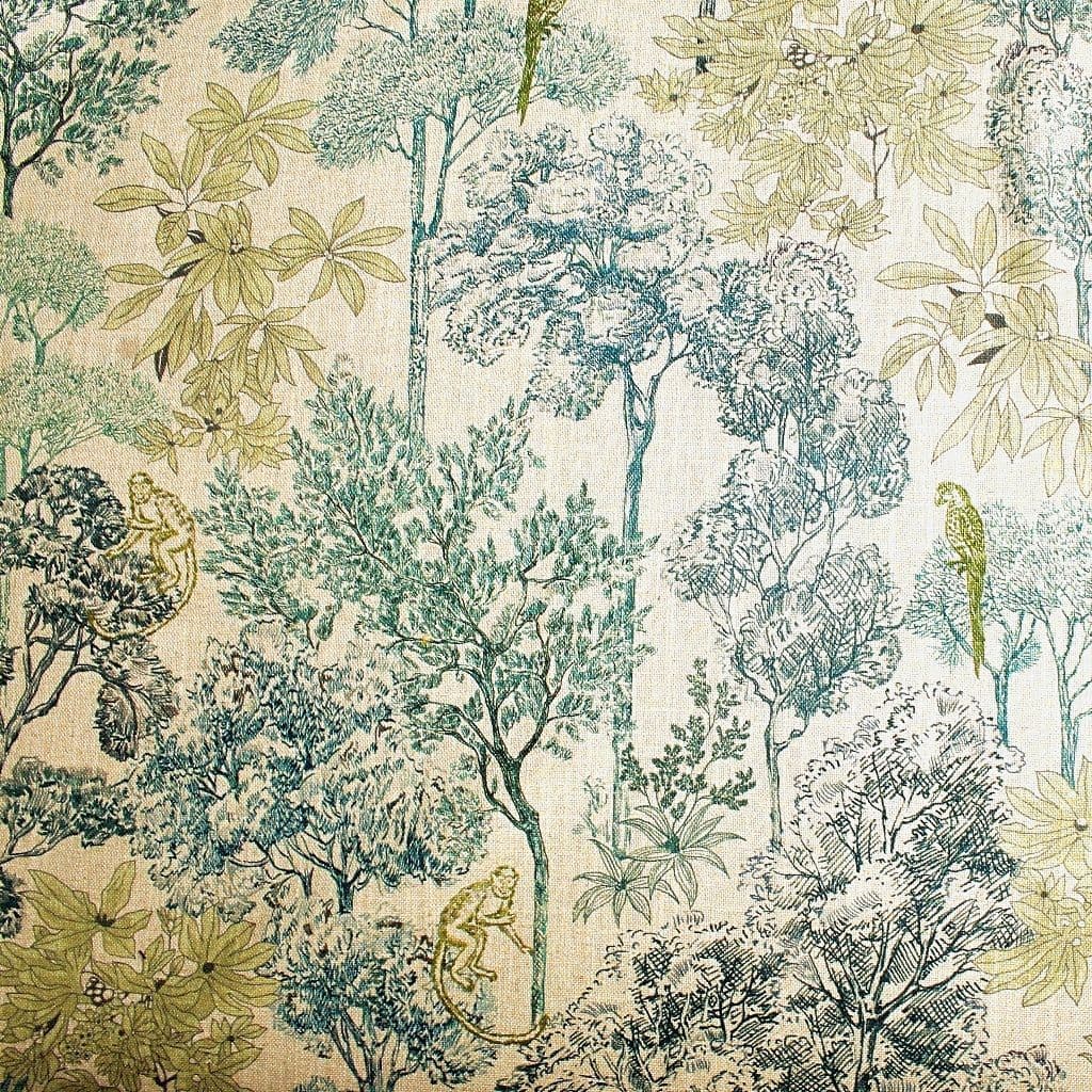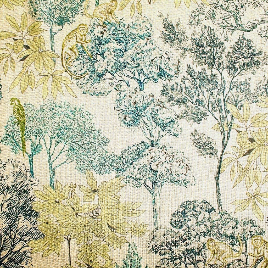 Large-scale botanical design of trees, leaves, parrots and monkeys in soft greens, teals and blues. Perfect for curtains, blinds and upholstery.